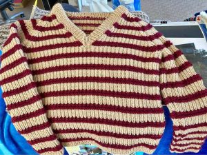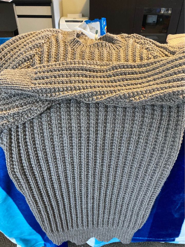 Hand knitted mans jumper pure wool from Bendigo 5x200gm balls. Sleeve length 49cm from underarm. By request length 52cm from underarm. Allow 6 weeks to make. Can knit any size any pattern, if you provide your own wool price is obviously cheaper. Pickup from LochSport or Sale.